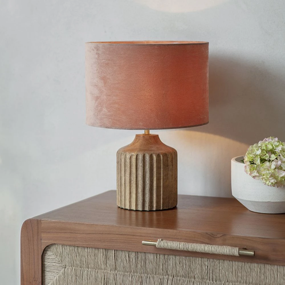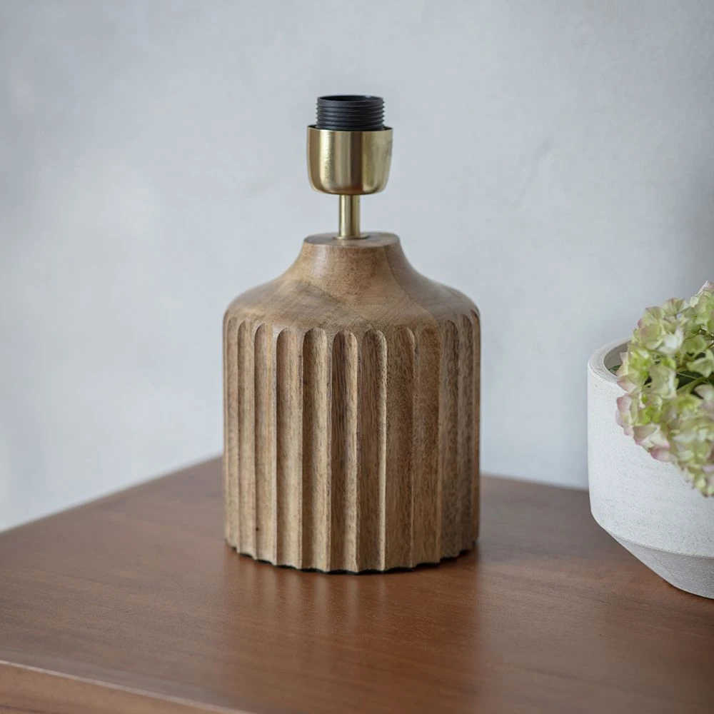The vertical grooves add textural interest, highlighting the natural character of the mango wood. Ideal for cosy corners, this small yet chunky table lamp complements all interiors while providing ambient and task lighting for reading, relaxing and entertaining. Finish with a neutral or bold coloured shade to complement or contrast with your décor.