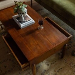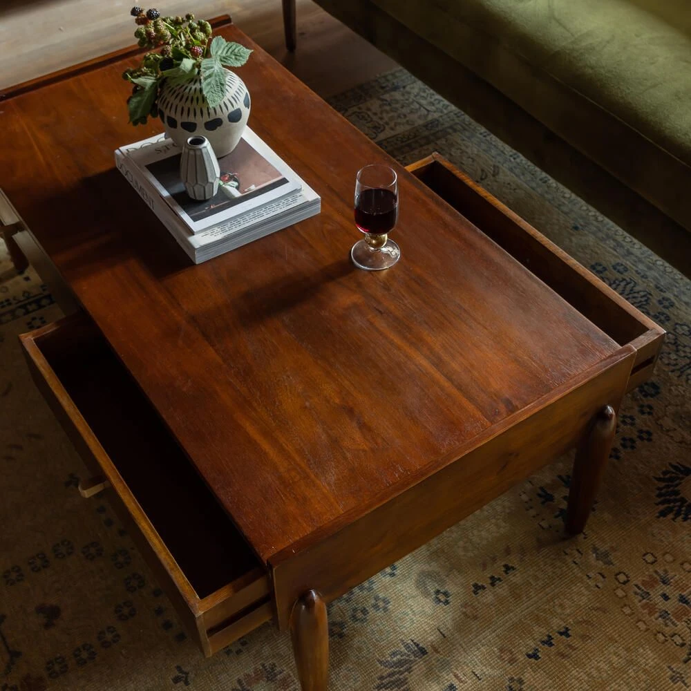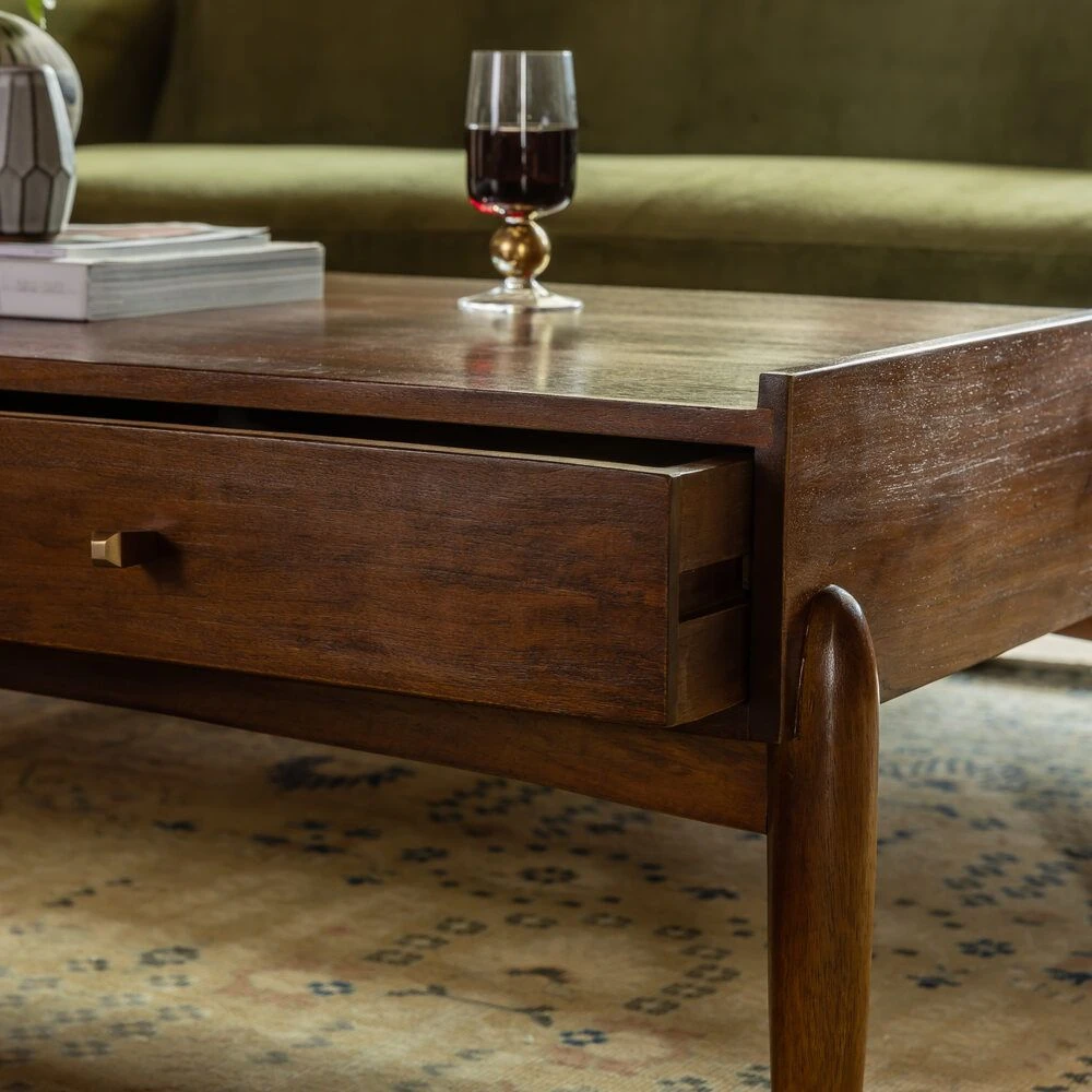 In a beautiful stained mango wood finish with delicate square brass knobs, our Quinn Coffee Table oozes mid-century appeal. With four handy storage drawers, this multifunctional piece is a great addition to any living space.