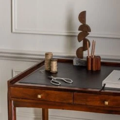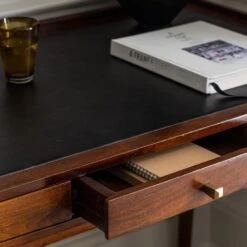 The desk has three drawers for keeping papers and stationery tidy, a gorgeous soft black leather top for that classic desk appeal, and a lovely vintage patina.