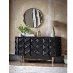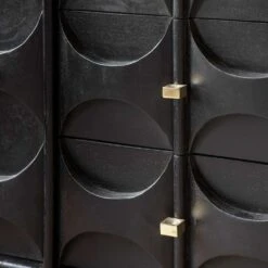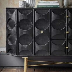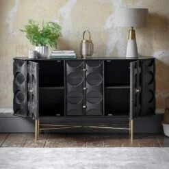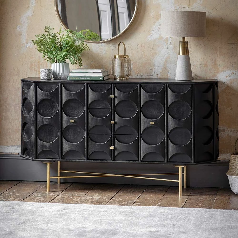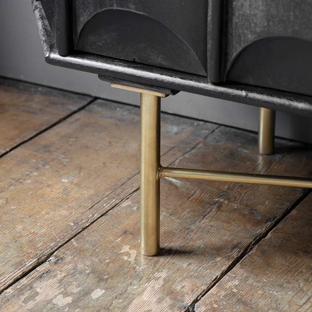 With stacks of storage space inside, our striking Revolution Sideboard comes in an attractive black stained mango wood finish with contrasting brass plated legs and matching handles for that on-trend metallic touch. Ideal for crockery, cutlery and glassware in the dining room or for keeping books, games, records, DVDs and more in the living space, it will add instant wow factor to any interior. It would also make a handy addition to a large hallway or landing.