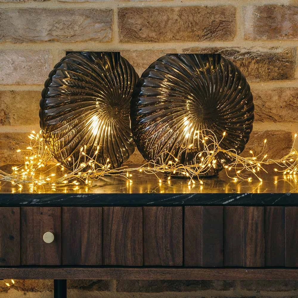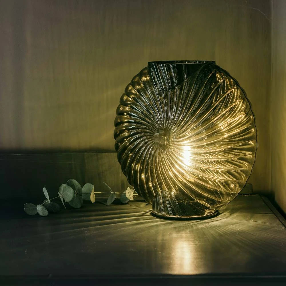 Create a soft glow in any room with our intricately crafted glass Ripple Table Lamp. Available in three colours – Peach, Grey and Green – the 20cm x 20cm glass table lamp draws inspiration from sea ammonites and features a generously sized LED light. The lamp emits a gorgeous glow, bringing a touch of glamour to any dark corner.