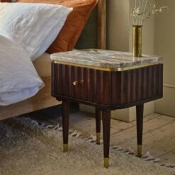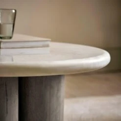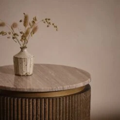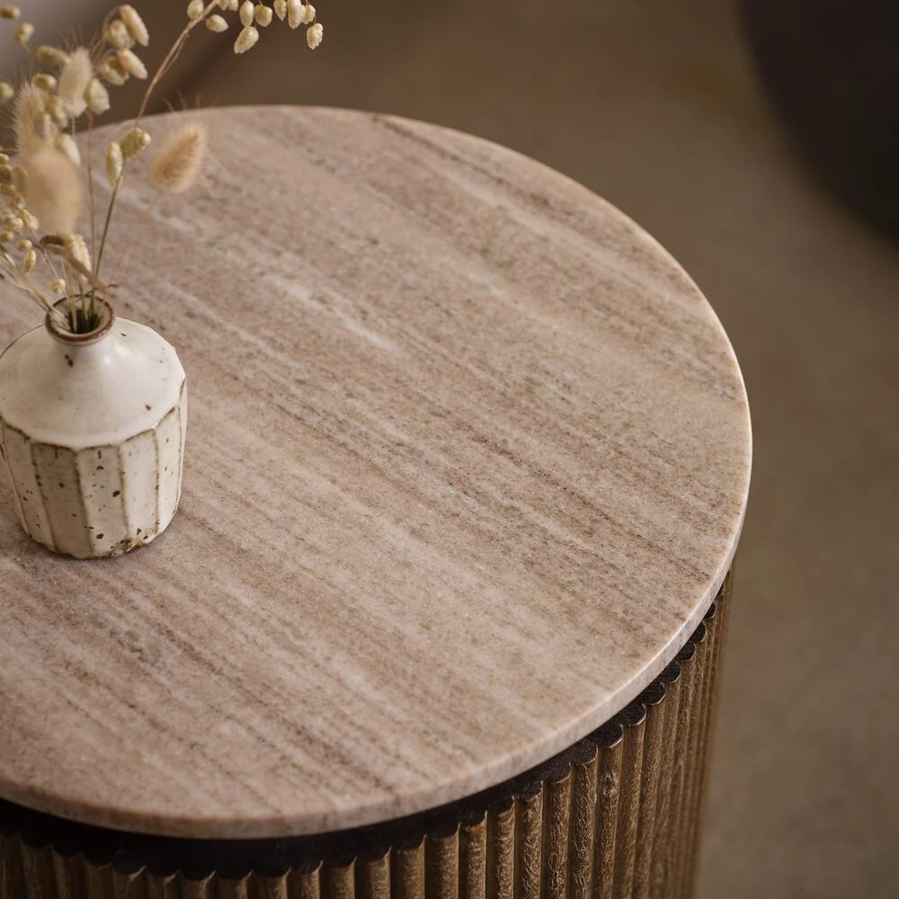 Understated yet with a statement look and luxury feel, our Rondo Side Table combines a sturdy round textured base made from sustainable mango wood with a warm-toned marble top and discreet antique brass detail running around its perimeter.
