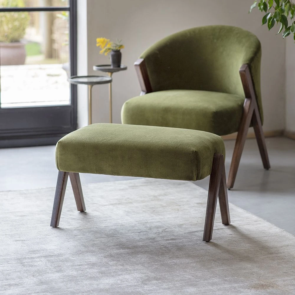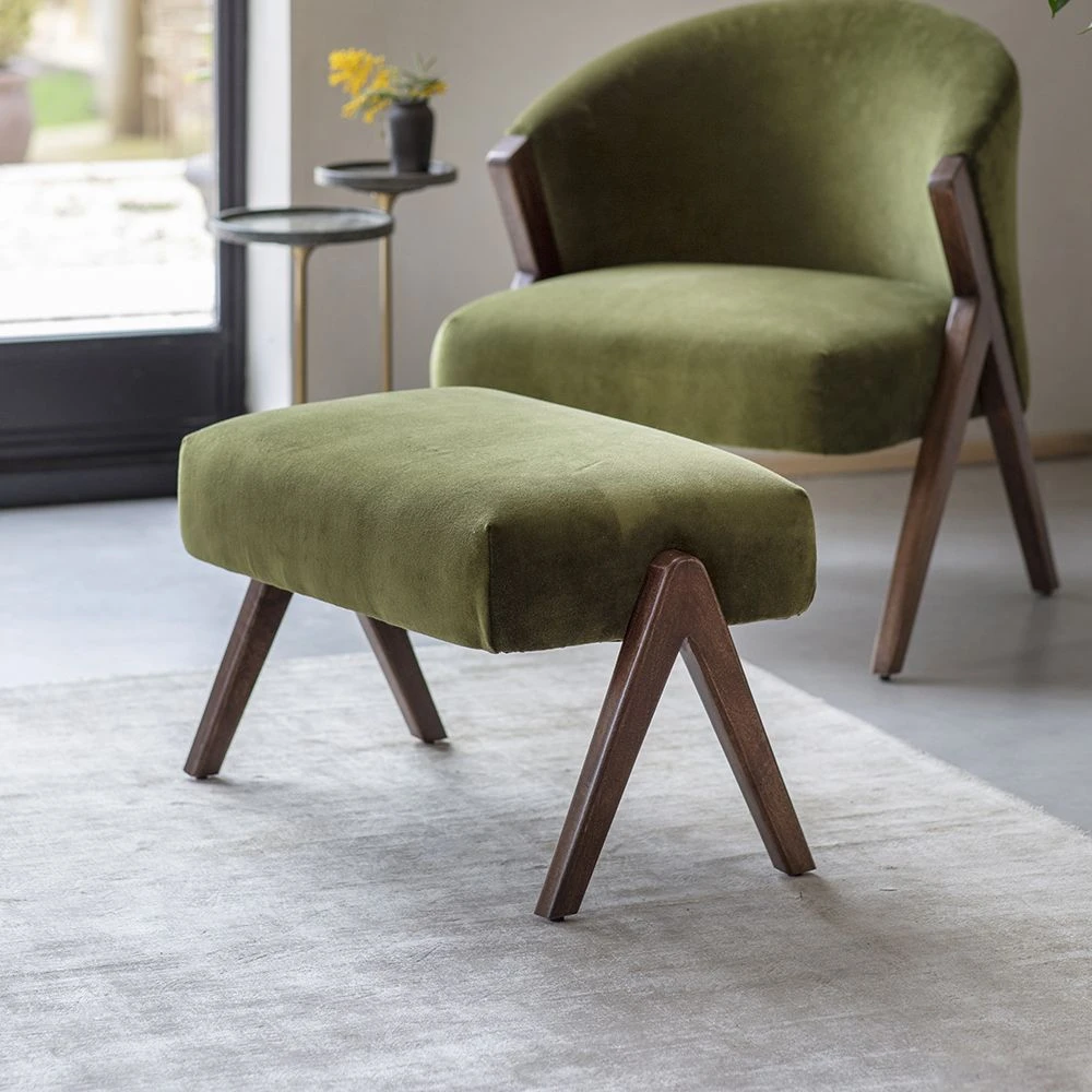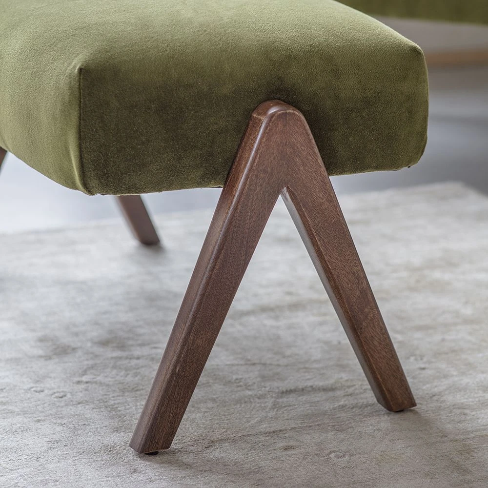 Drawing inspiration from Parisienne furniture boutiques, our modern velvet green footstool also features clever leg design detail to mirror the accent chair. Handcrafted and hand upholstered by artisans in India, its mid-century inspired style suits all spaces and it can be drawn up close to an accent chair for a luxurious chaise look and feel.
