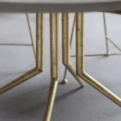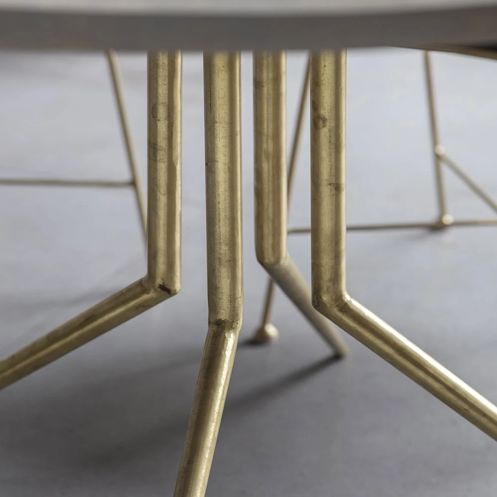 This large round table features a parquet sunburst pattern on its surface which is made up of carefully arranged pieces of mango wood. The table is finished with four brass plated iron legs which are strong and sturdy.