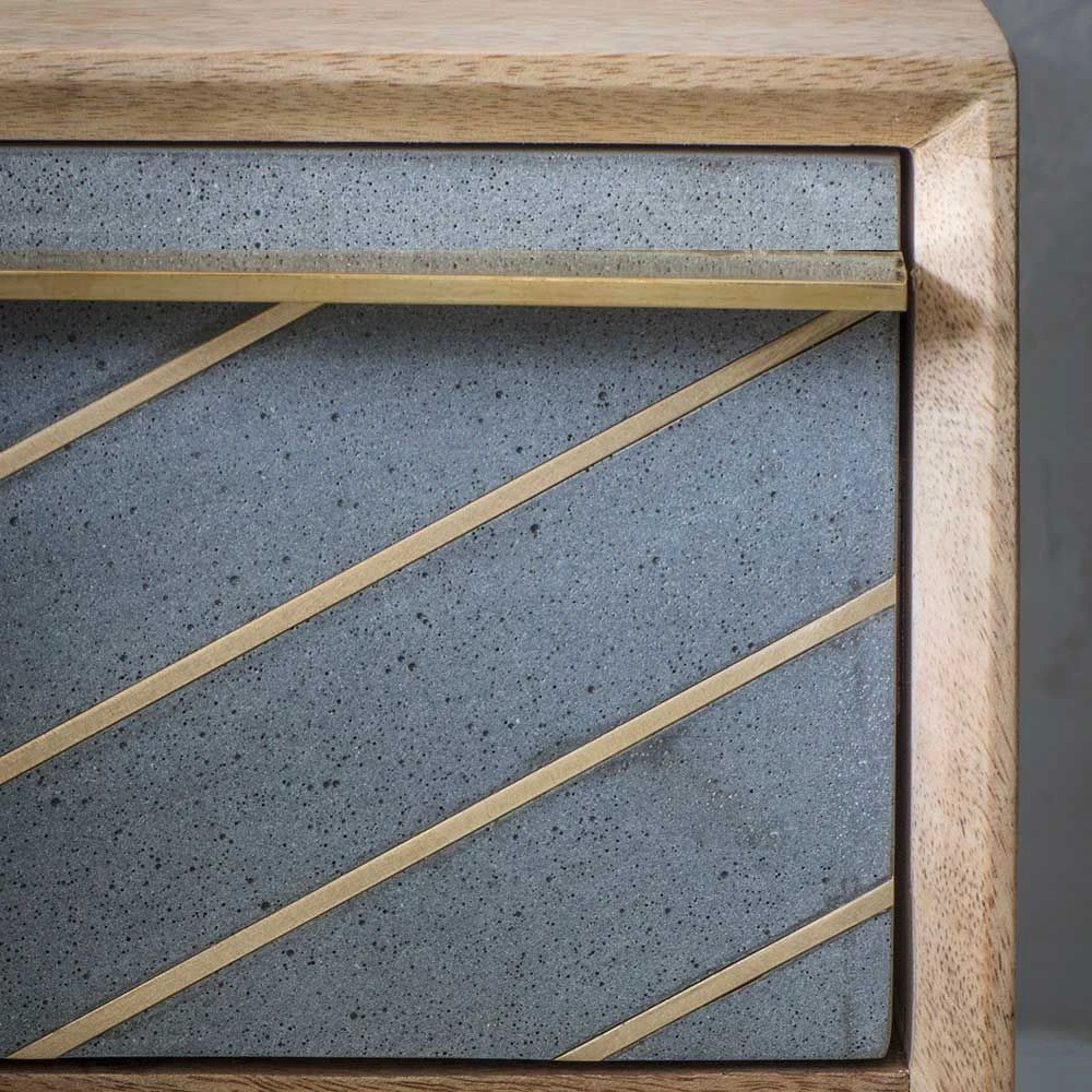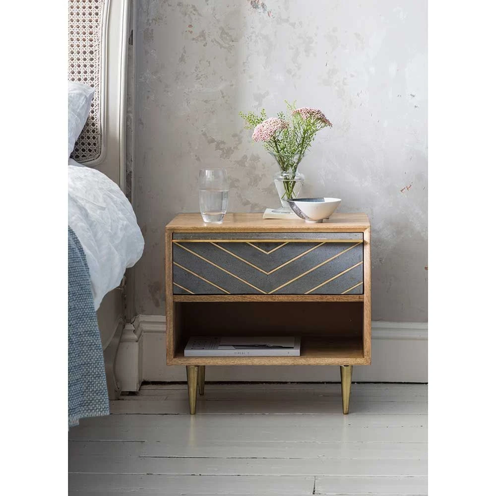 Our Toshi Bedside Table is the perfect addition to any bedroom, crafted from mango wood with a stunning cement and brass inlay that adds a luxe look to the vintage industrial feel. Perfectly practical as well as stunningly chic, it offers a generously sized drawer with open shelf space below โ great for magazines and books as well as reading glasses and other bedtime essentials.