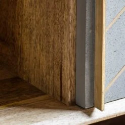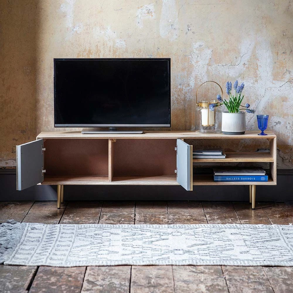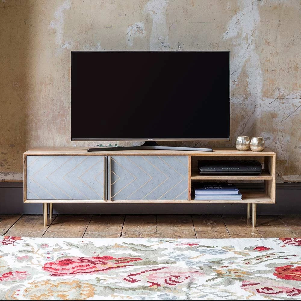 Our Toshi Media Unit is a beautifully designed low-level cabinet, which is crafted from mango wood with a cement and brass inlay to the two-door front, which is perfect for concealing CDs, DVDs and console games. Ideal for bringing the industrial trend into the living area or an open-plan space, the attractive brass inlay with matching brass handles helps to elevate the design into something more luxury and less urban.