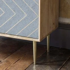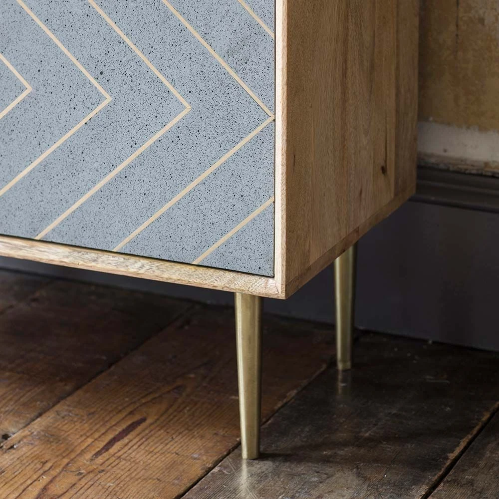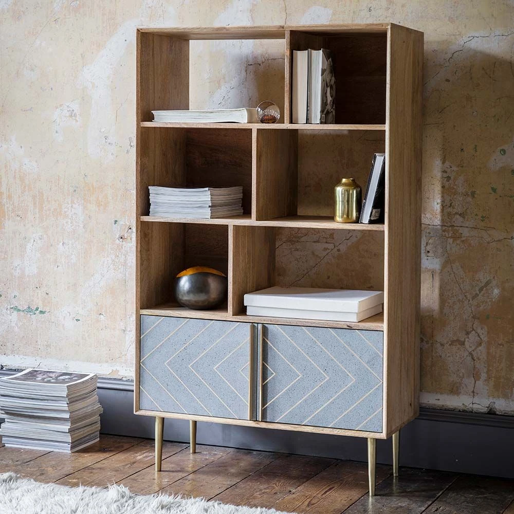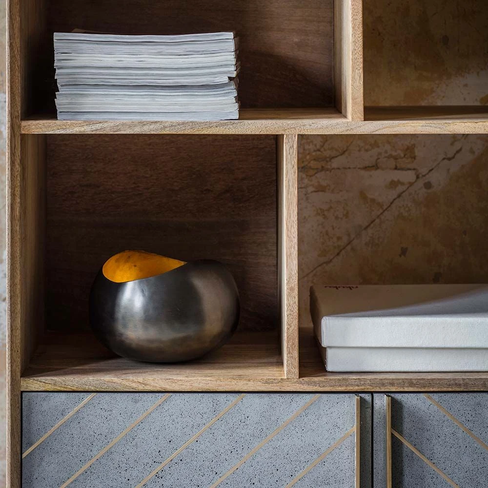 Our Toshi Shelving Unit is the ultimate in designer chic, combining practical storage space with a stylish finish that will complement any interior design scheme. Carefully crafted from mango wood with a stunning cement and brass inlay to the lower cabinet doors, this freestanding piece of furniture could easily be used in the living area, dining room or home office.