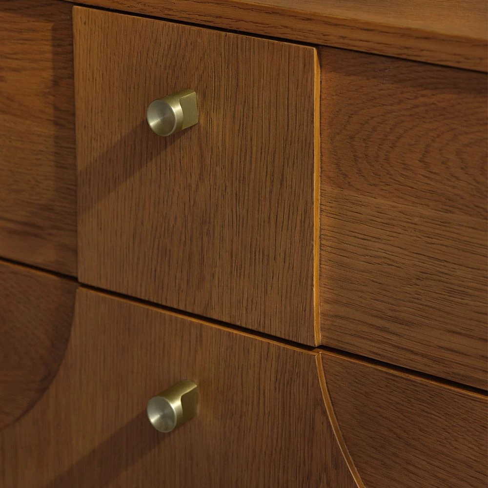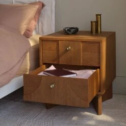 A quietly confident two-drawer bedside unit, our Umi Bedside Table features a distinctive swooping design detail on its front drawer panels with subtle brass handles and an understated angled wooden base.