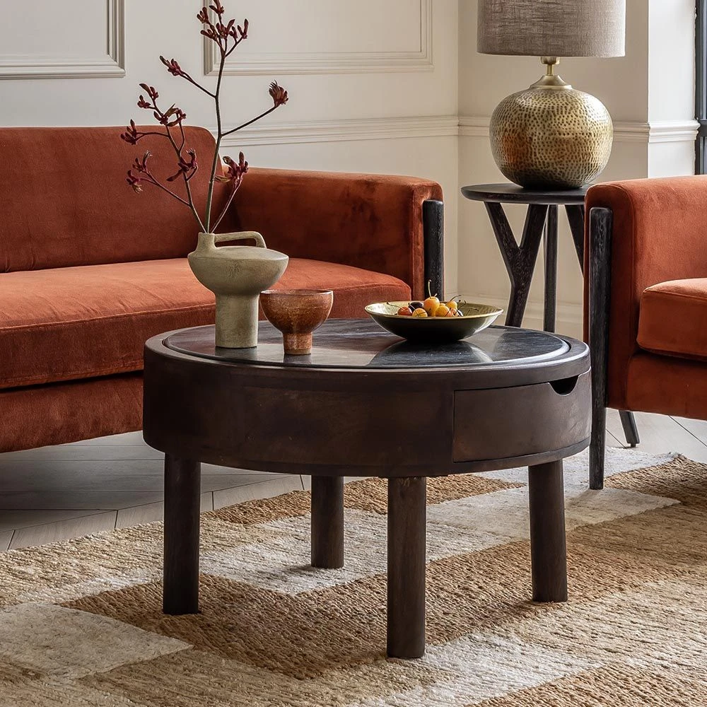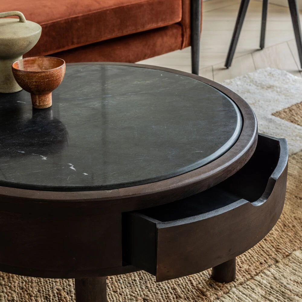 Made from sturdy and hardwearing dark stained walnut wood with a sleek black marble top, the circular, low-level design is ideal for drinks and snacks and its two storage drawers create that all important place to hide things away.